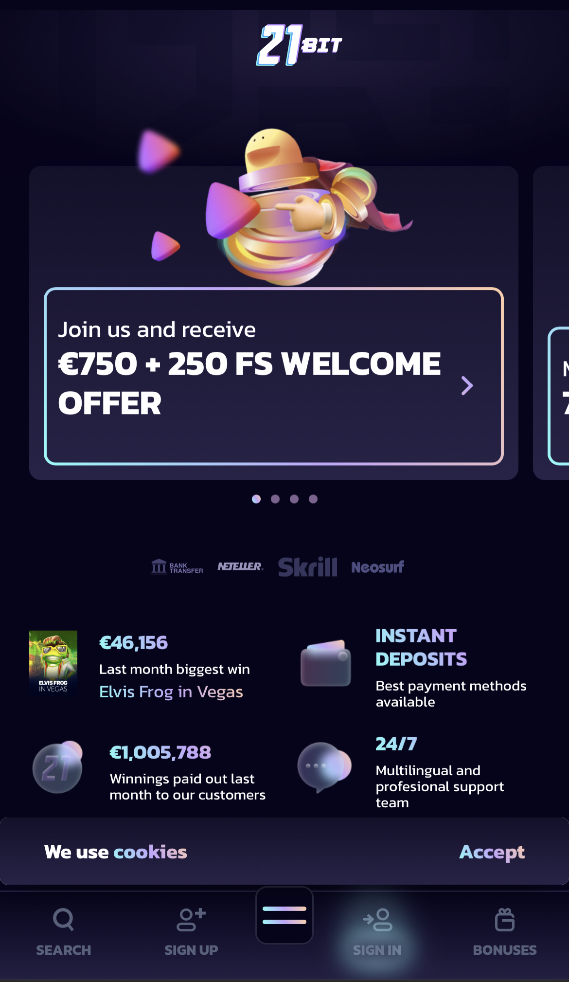 At first glance, 21bit Casino stands out as a sleek and modern gaming platform that ticks all the essential boxes for real-money gambling. It boasts an impressive selection of games, fast and reliable payment options, and enticing bonuses. Adding to its appeal is a highly rewarding loyalty program designed to reward dedicated players.