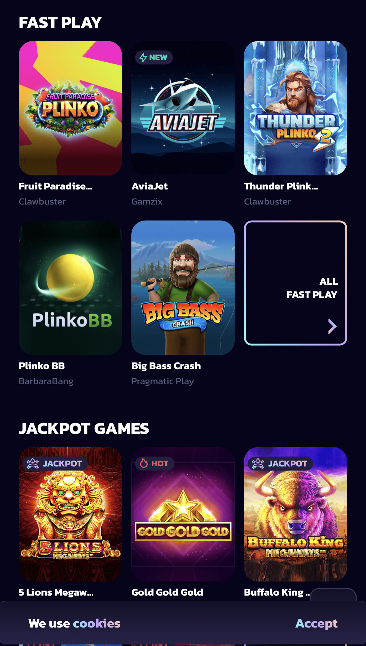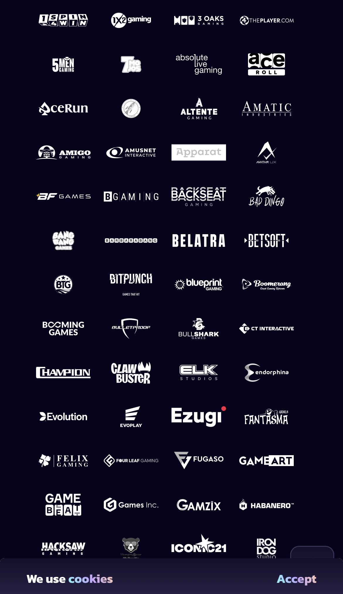 1x2Gaming, 4ThePlayer, Amatic Industries, Belatra, Betsoft, BGaming, Blueprint Gaming, Booming Games, ELK, Endorphina, Evolution Gaming, EvoPlay, Fantasma Games, Felix Gaming, Foxium, Fugaso, Gamebeat, Gamzix, Habanero, Igrosoft, iSoftBet, KAGaming, Mascot Gaming, Microgaming, NetEnt, No Limit City, Onlyplay, Peter & Sons, Platipus, Play N Go, Playson, Playtech, Pragmatic Play, Push Gaming, Quickspin, Red Tiger Gaming, Relax Gaming, Spinomenal, Spribe, Thunderkick, Tom Horn Gaming, VIVO Gaming, Wazdan, Yggdrasil Gaming, August Gaming, Bad Dingo, Bang Bang Games, Boomerang, BTG, Bulletproof Gaming, Four Leaf Gaming, Games Inc, Jade Rabbit Studio, Lucky, Lucky Streak, Nucleus Gaming, Pragmatic Play Live, Reel Play, Reflex Gaming, Retrogaming, SilverBack, Smart Gaming Group, SoftSwiss, Zillion + 20 more (less)