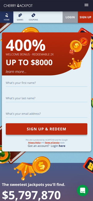400% welcome bonus — up to $8,000 in free funds. Use code CHERRY400, deposit by card or crypto, and claim the bonus twice on your account.