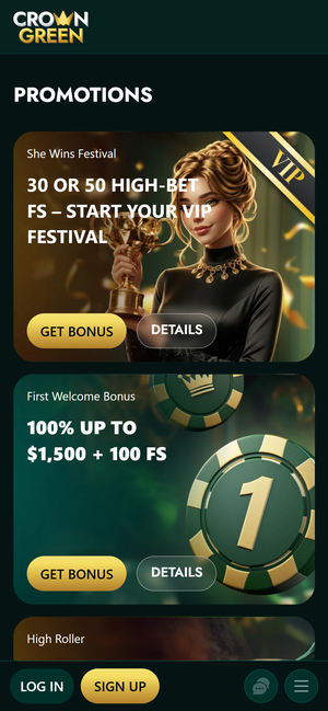 CrownGreen runs a very aggressive promotional structure, combining a traditional welcome package with recurring promotions and VIP incentives.