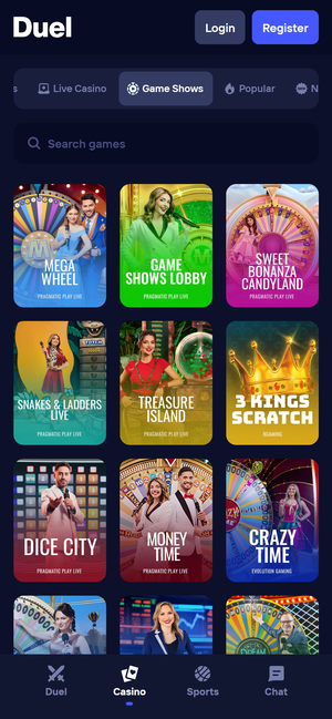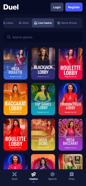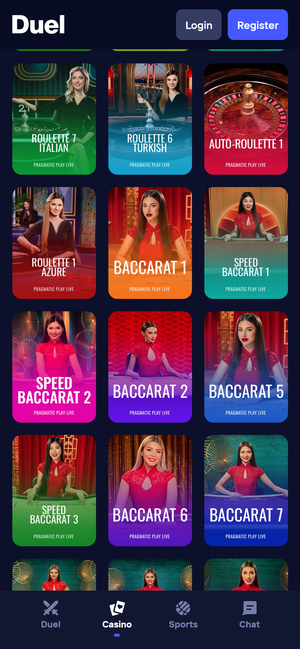 Duel offers a full casino and sportsbook experience, including original games, slots, live casino, and sports betting with live markets and an event builder.