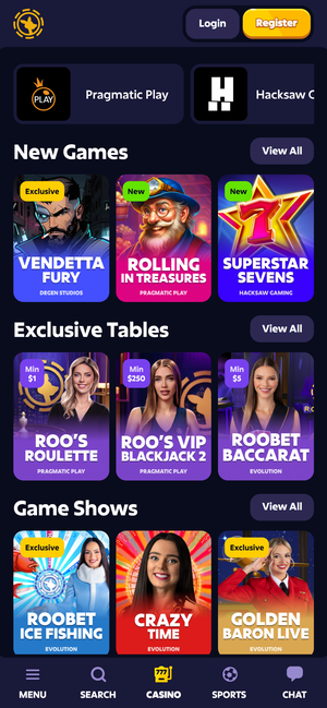 Roobet offers a broad catalog including slots, live casino, crash games, game shows, table games, and niche formats. The platform integrates 70+ game providers, featuring major studios such as Pragmatic Play, NetEnt, Play’n GO, Hacksaw Gaming, Nolimit City, Microgaming (Games Global), and others. This ensures strong content depth and modern, high-volatility gameplay options.