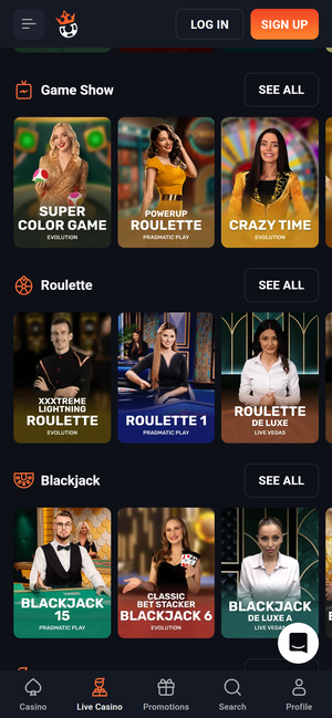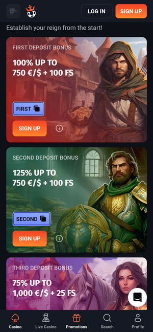 The design is built around a fantasy medieval theme with strong visual identity and character-driven elements. Navigation is smooth, and the platform is optimized for mobile usage. Features such as collections, missions, and live game sections are well integrated. The casino also promotes an app-style experience with notifications, reinforcing long-term engagement.