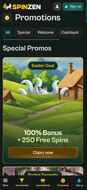 New players can access up to €2000 + 300 free spins through tiered deposits, while additional promos like Easter Deal and Spring Serenity boost early value. The structure is designed for long-term engagement with reload bonuses, daily cashback up to 10%, and ongoing Lotus rewards, giving players continuous incentives beyond the initial welcome offer.