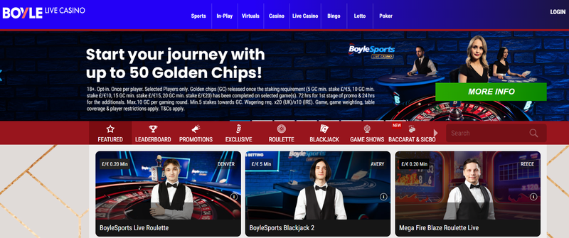 BoyleCasino’s live games section offers a clean, well-organised layout that makes it easy for Irish players to jump straight into real-dealer action. The navigation bar lets you instantly switch between categories such as Roulette, Blackjack, Game Shows, Baccarat & Sicbo, as well as featured and exclusive tables. Each category is clearly labelled, helping players find their preferred game type without scrolling through long lists.