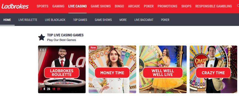 Ladbrokes Casino offers a vast selection of games divided into clear categories — Slots, Table Games, Jackpots, Instant Win, Bingo, and Live Casino. The catalog includes hundreds of popular titles from world-class providers such as Playtech, Pragmatic Play, Evolution, and Red Tiger, ensuring both variety and quality.